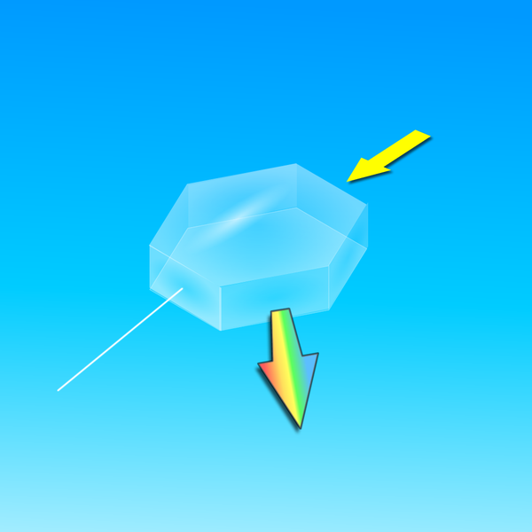 condensation nuclei, forming in stoichiometric quantities. Sunlight hitting the surface of the crystals reflects off, appearing as white cirrus clouds. But some solar rays enter along the edges of the crystal where they refract and have their spectrum dispersed like in a prism, creating a rainbow spread of colors that are bent within the crystal and exit through another edge.