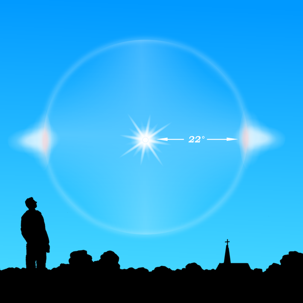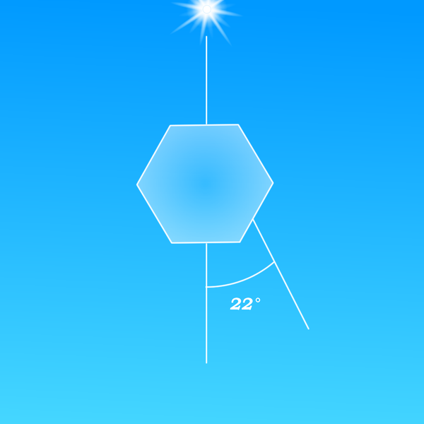 The sunlight is refracted through the ice crystal at an angle of 22 degrees from the direction of the incident light rays. Thus, the refracted sunlight appears to originate from a different direction in the sky than the Sun.