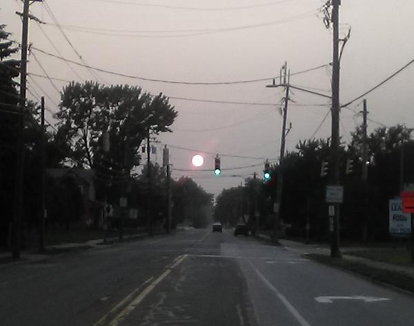 concern than whether or not airplane contrails are dastardly devices of destruction. For the last several summers, we've been told here in Cleveland that "Canadian wildfires" are the cause of the noxious chemical haze which truly does pollute the skies, making the air actually hard to breathe and a sunset-looking Sun appear high above the horizon, as in this shot from 2023.