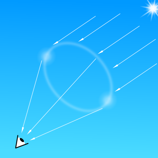 tend to lay flat in the air so that those directly horizontal to the Sun shine in the direction of your eye. All the other crystals oriented at random angles tend to form the parhelic circle, and are of lower density, hence lower brightness.