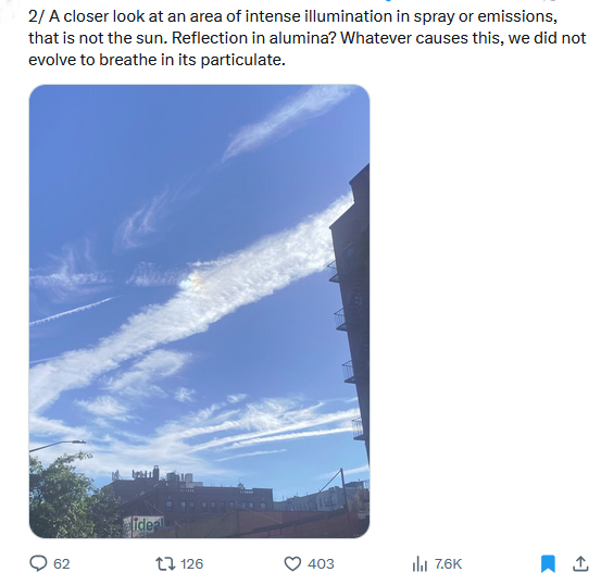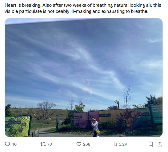 crime against humanity. I get physically ill from this foul air with headaches and labored breathing and have to stay inside and sleep. It's not just the power of suggestion since friends and loved ones have similar reports. But everyone else is fine with swallowing the official narrative of wildfire smoke, including all the chemtrail devotees in my life. What if the chemtrail story is a deflection promulgated by the bad guys to distract the suspicious segment of the