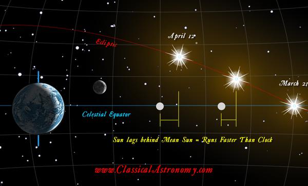 Sun moves more quickly through right ascension and thus catches up to the mean sun. (Don't worry if these new concepts are hard to follow, we're almost to the punchline.)